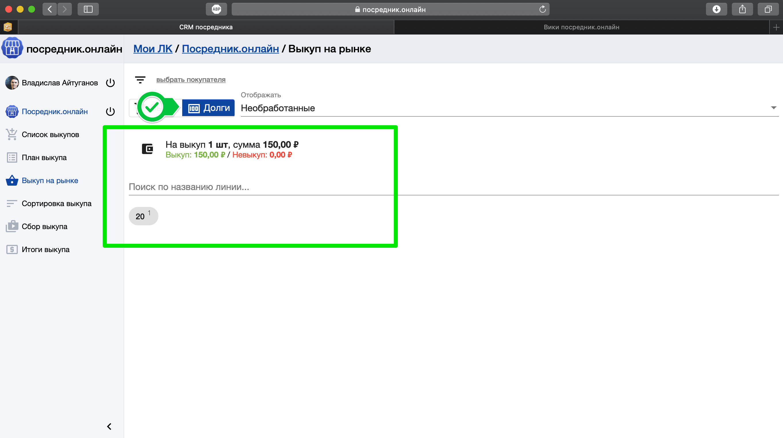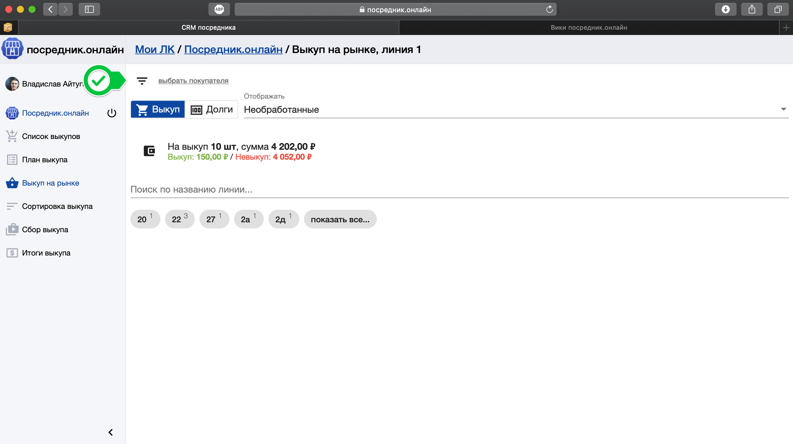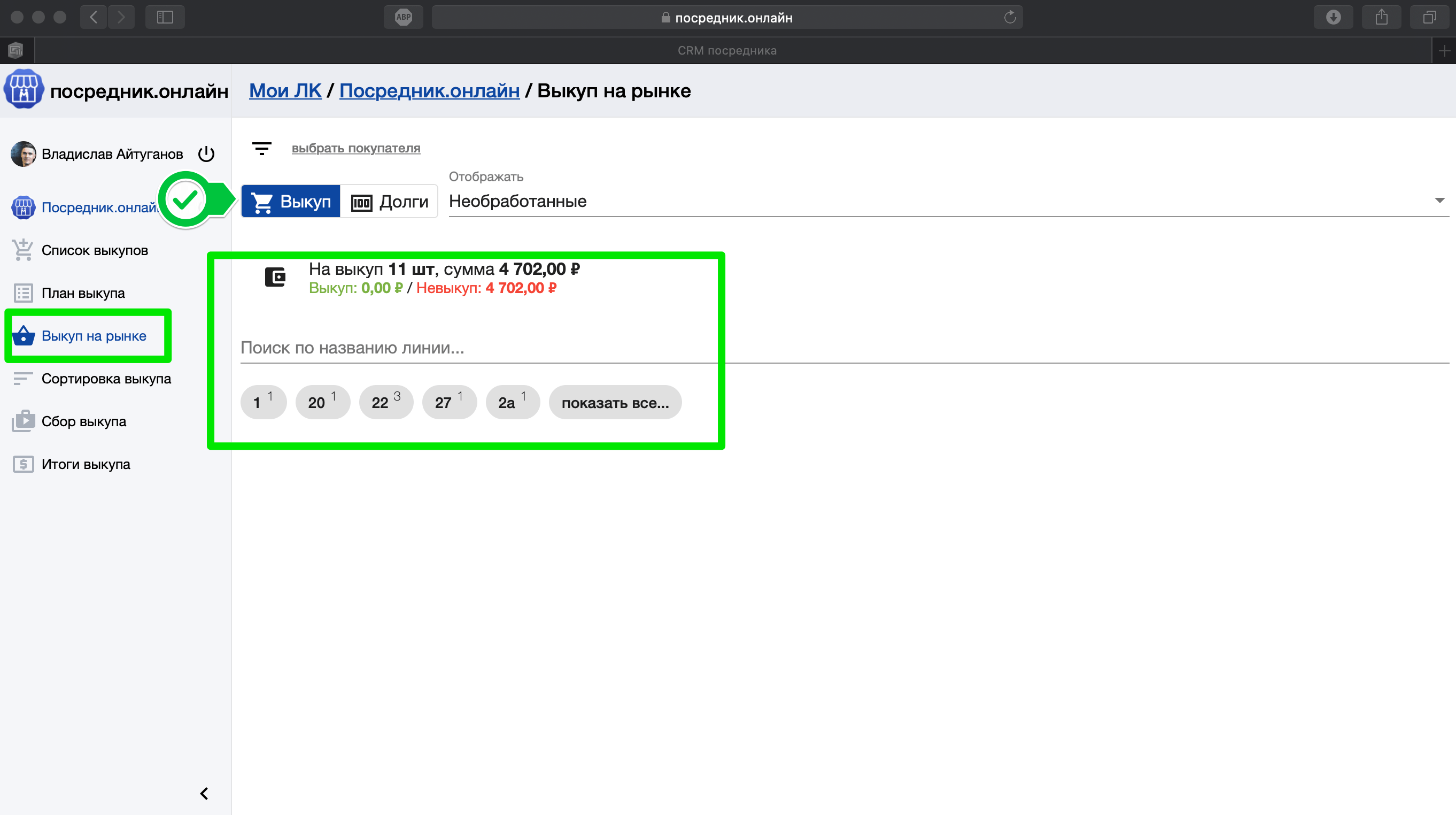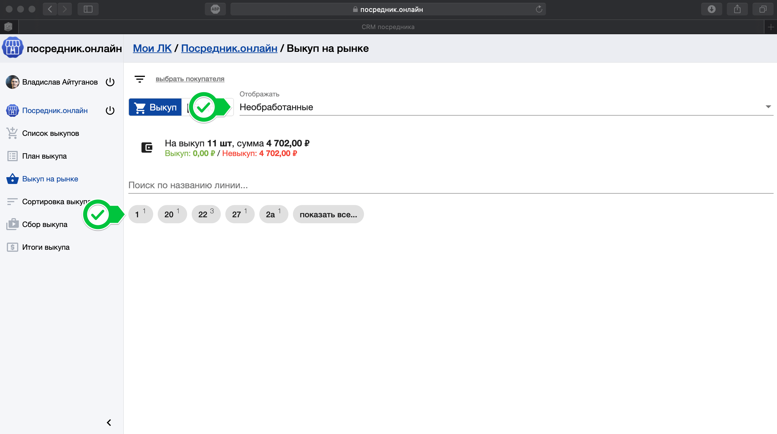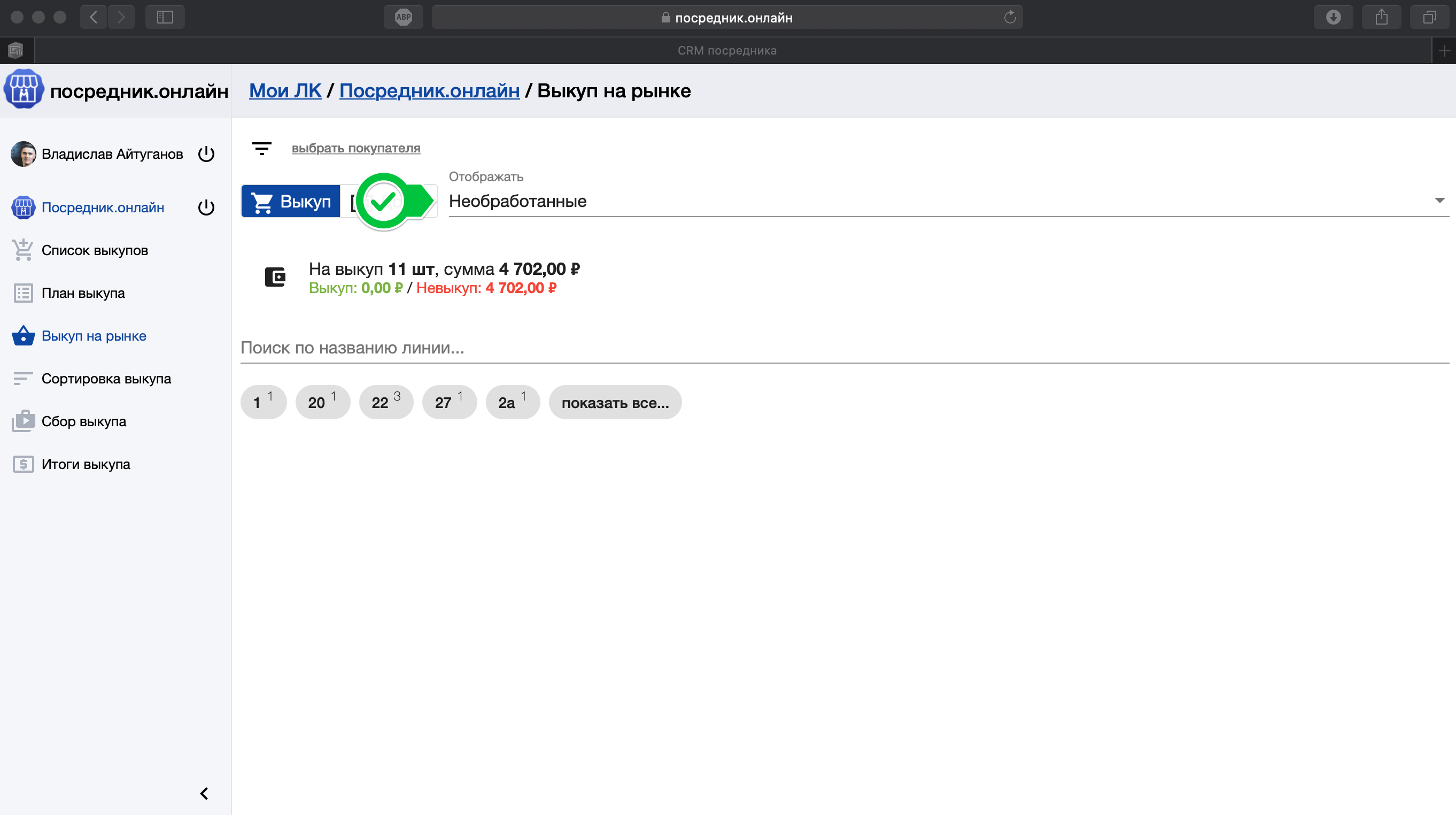 Давайте рассмотрим сам процесс выкупа. По умолчанию раздел покажет необработанные позиции без какой либо фильтрации, сгруппированные по линиям и местам, а также сумму и кол-во для всего выкупа, для выбранной линии и для всех мест выбранной линии. Линии и места следуют друг за другом в порядке возрастания.