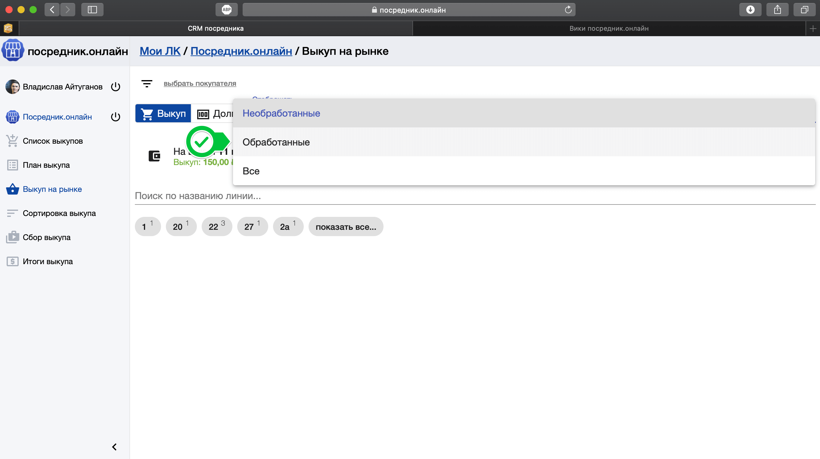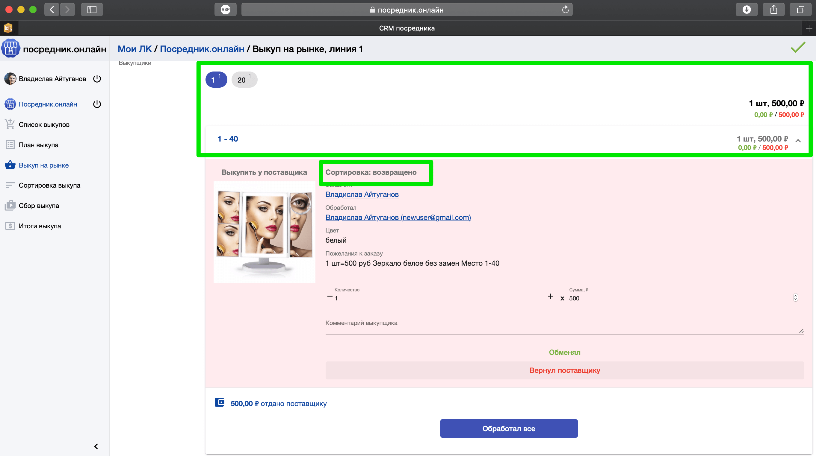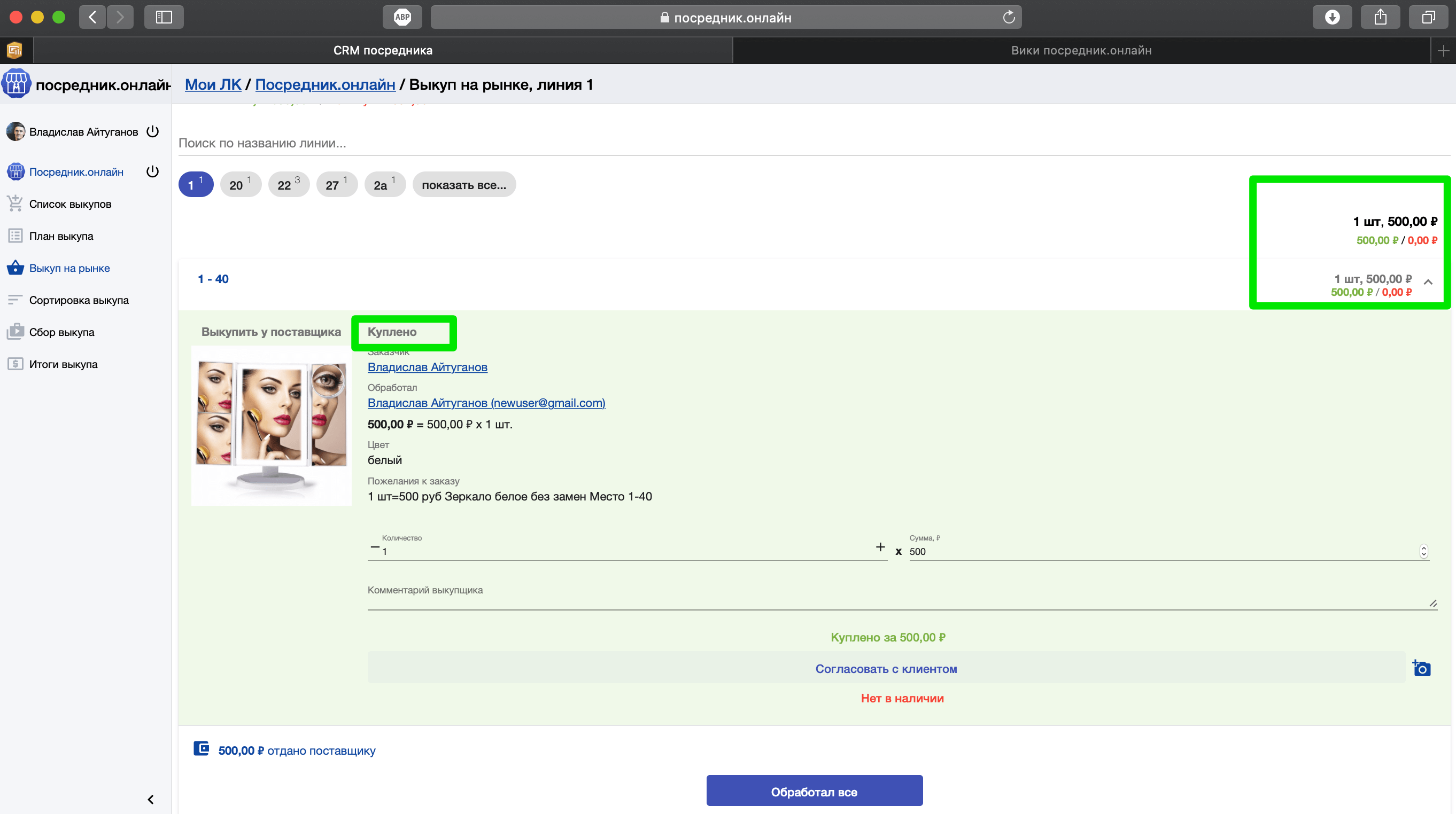 Также будет доступна кнопка "Обработал все", при нажатии на которую место будет перемещено из списка "необработанных" в список "обработанные". Если в этот момент все еще остались несогласованные позиции, то они снова попадут в "необработанные" тогда, когда клиент согласится на выкуп и вы сможете вернуться за этими позициями.