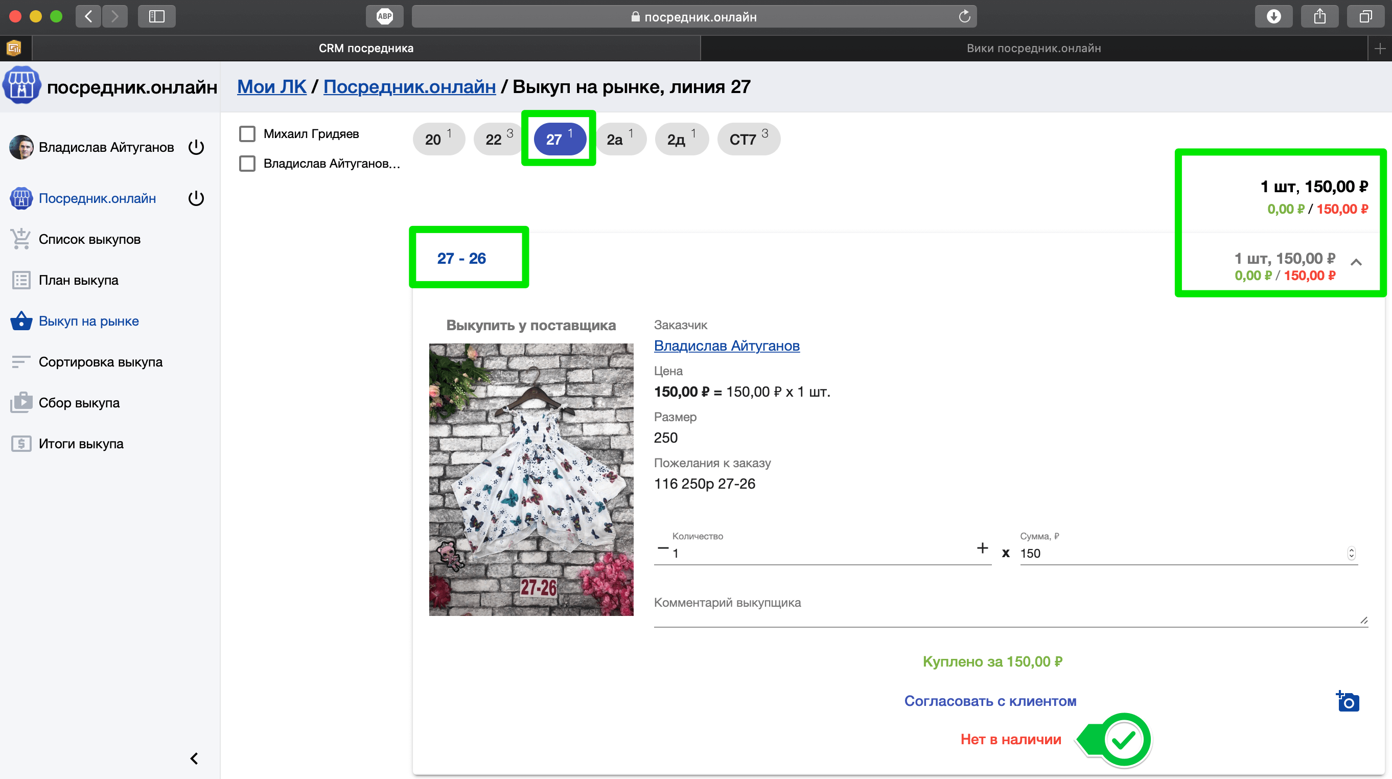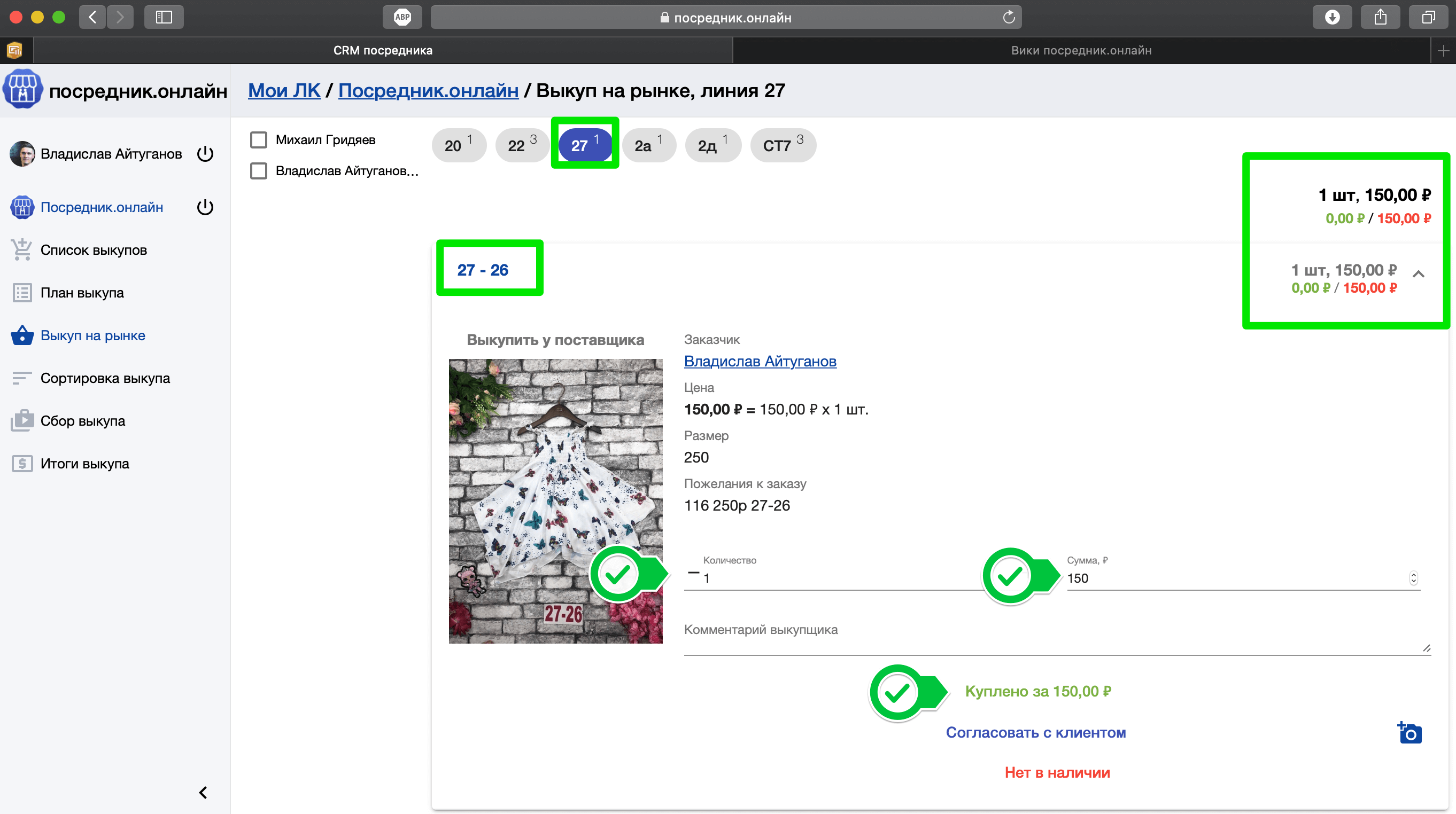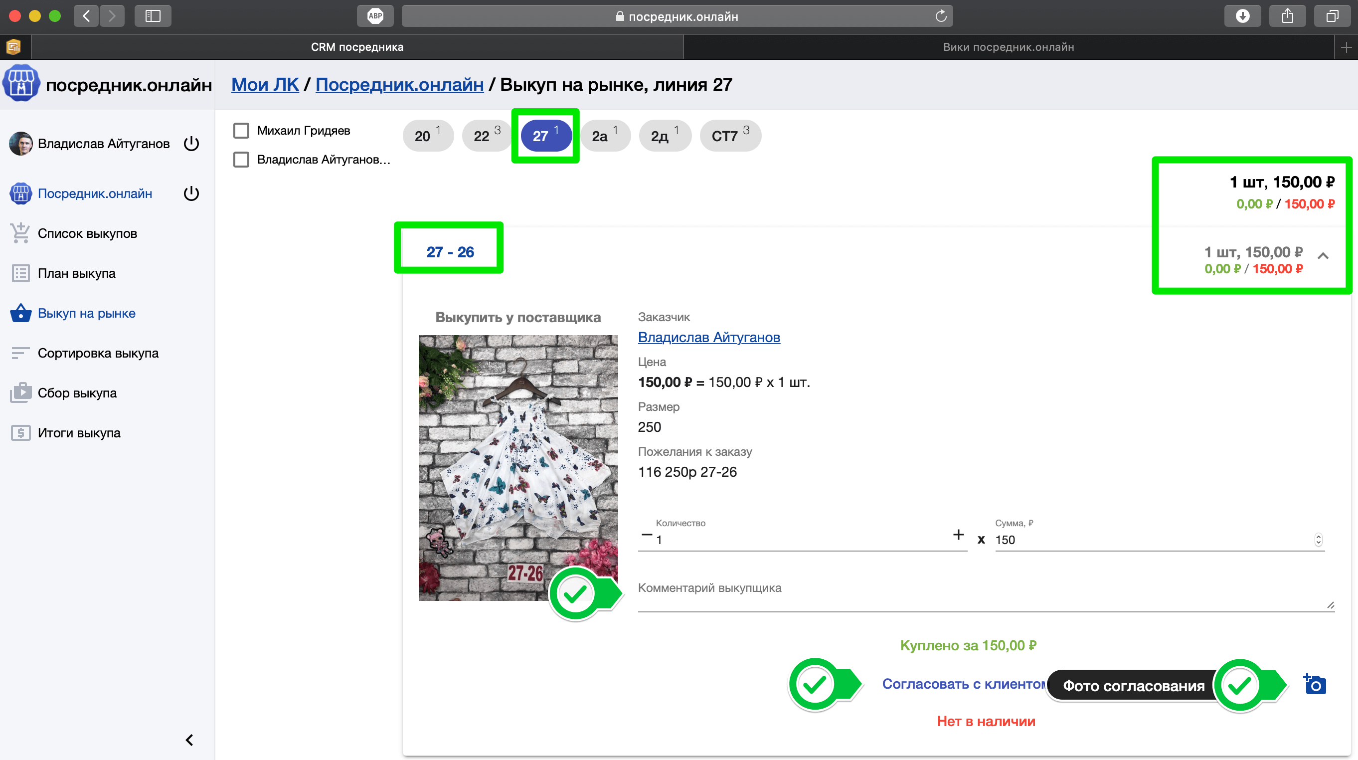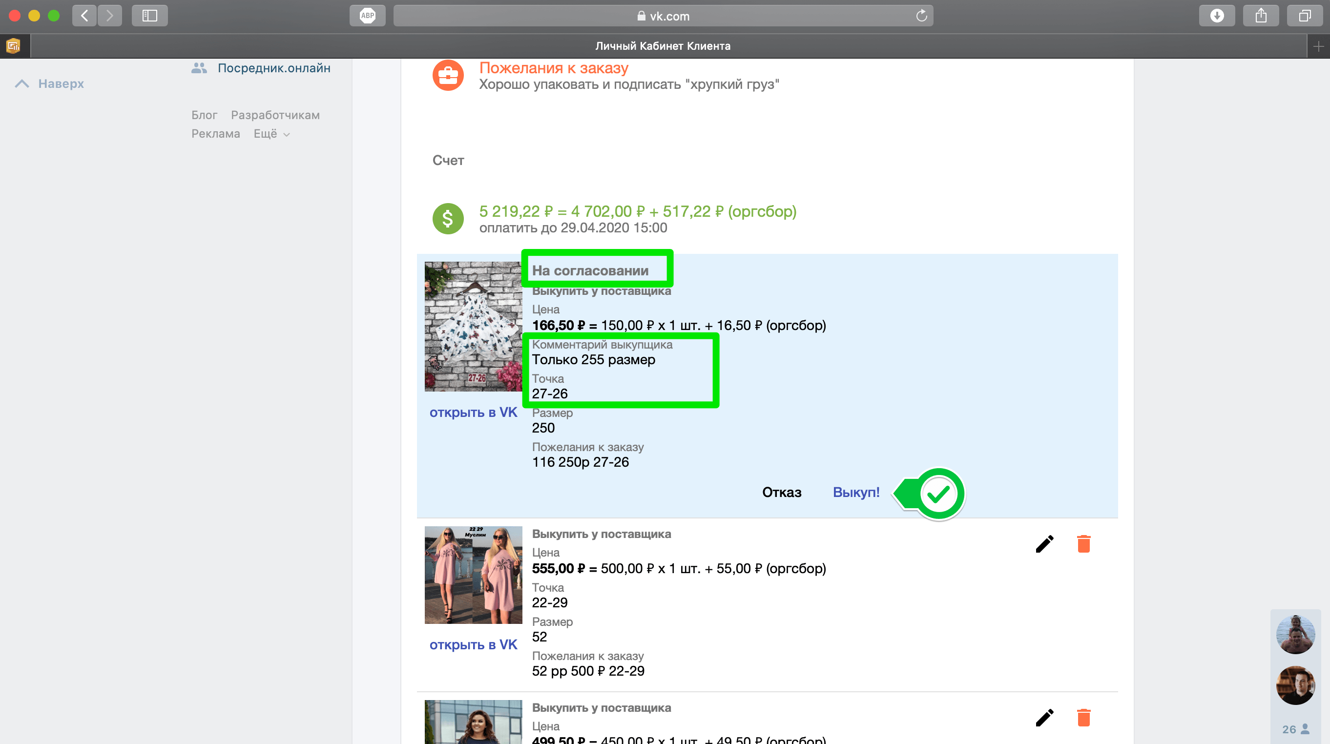 варианты покупки) и фотографию. Как только клиент согласует выкуп позиции, она сразу изменит статус на