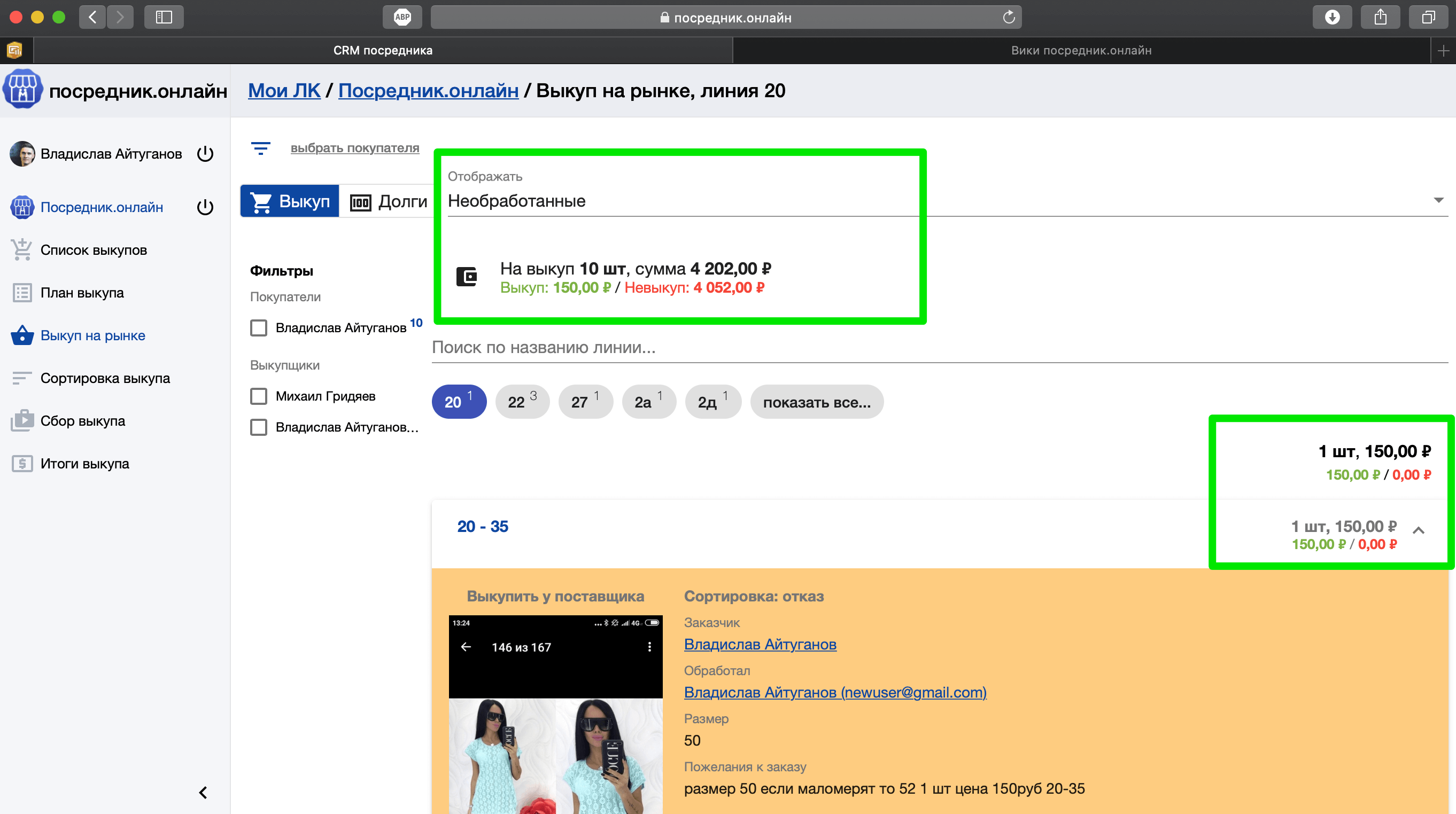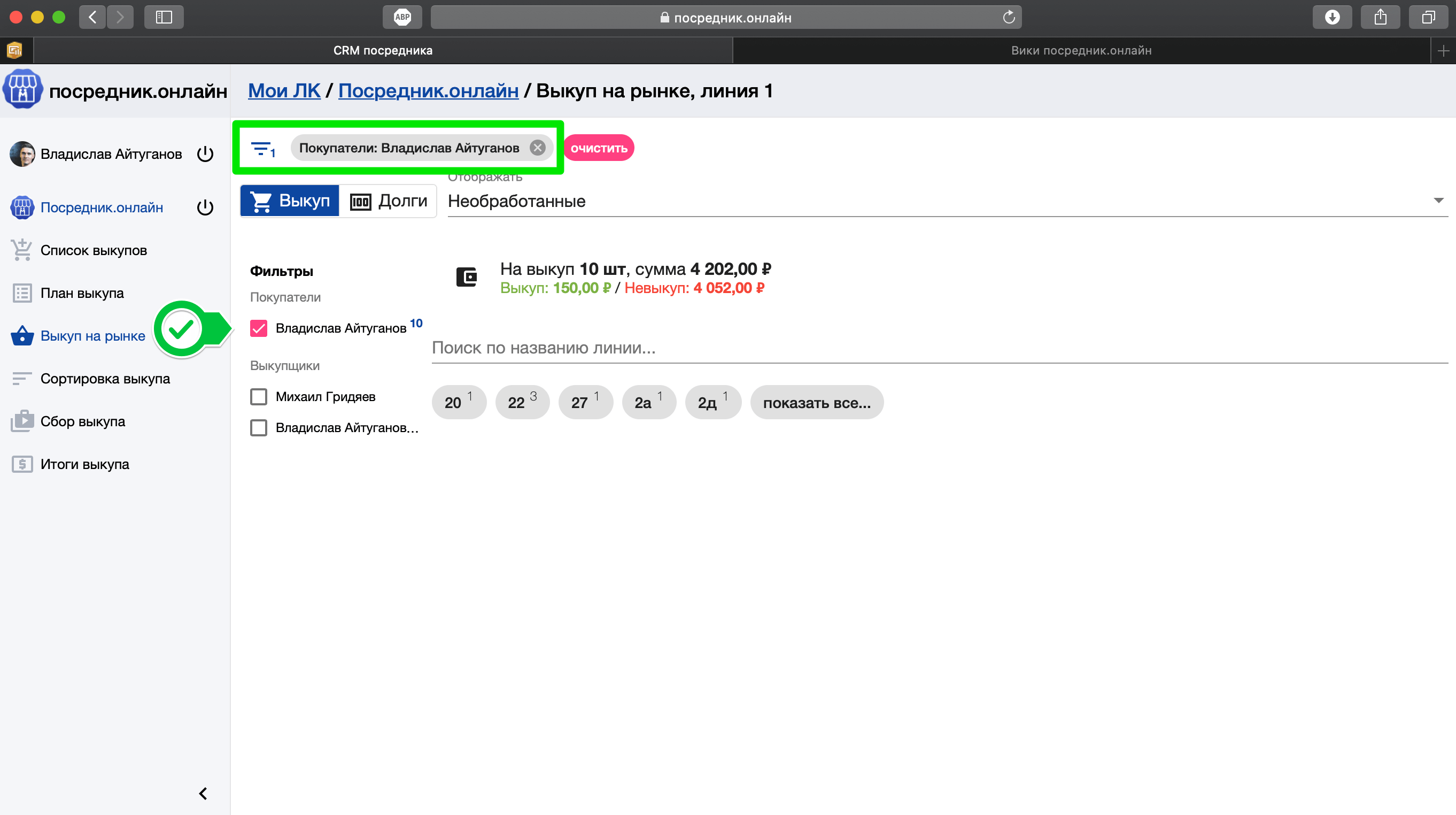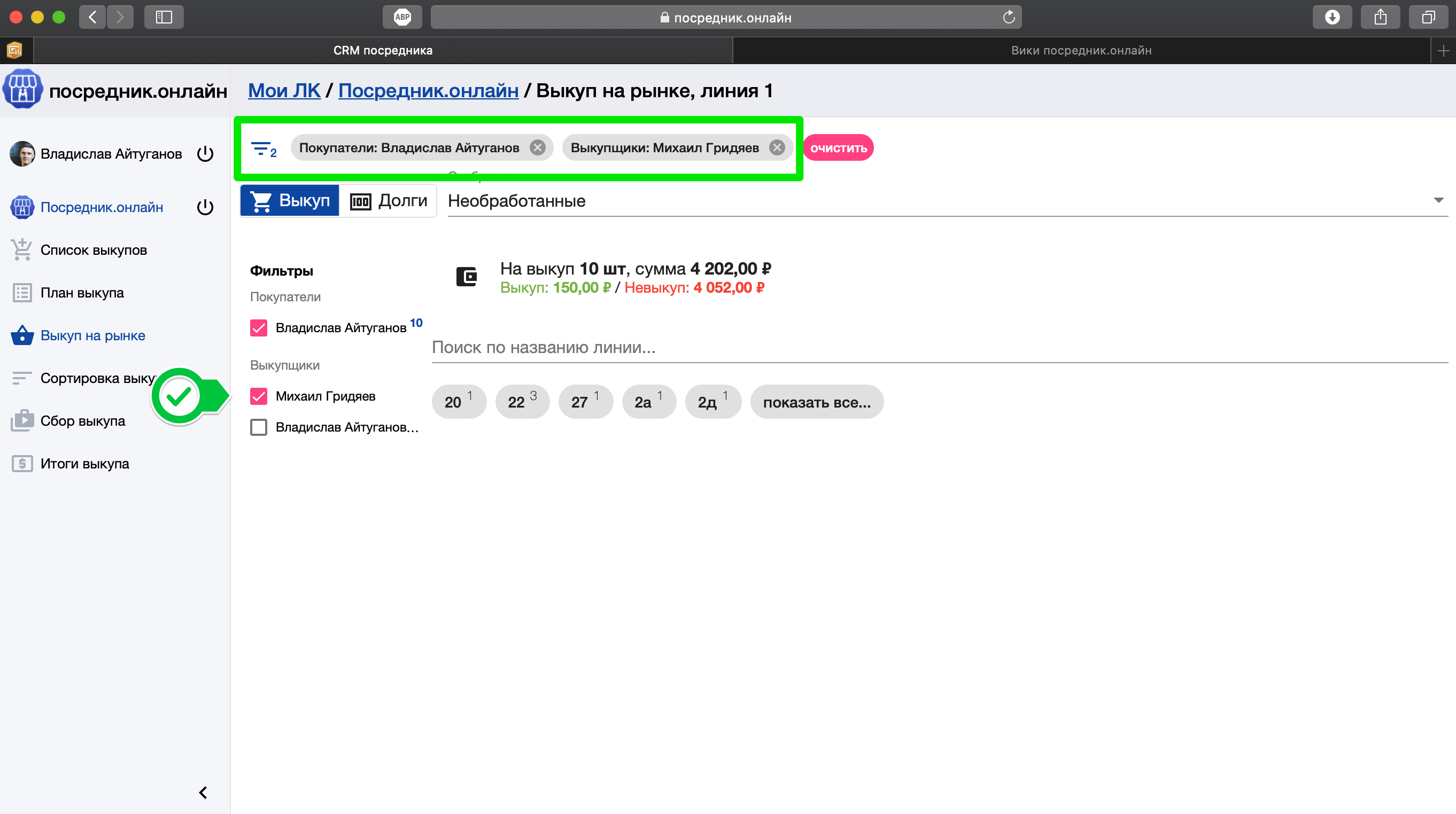 "Фильтр по покупателю" - данный фильтр позволит отобразить на выкуп только позиции выбранных покупателей, а также увидеть по ним суммы выкупа, невыкупа и прогресс.