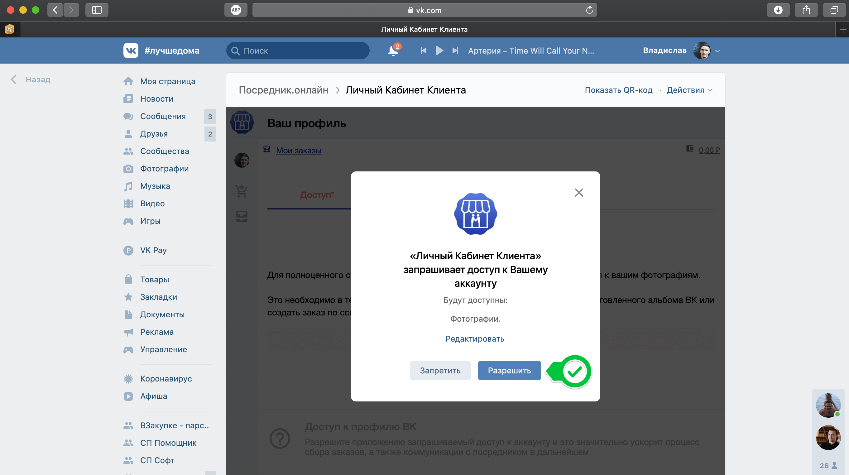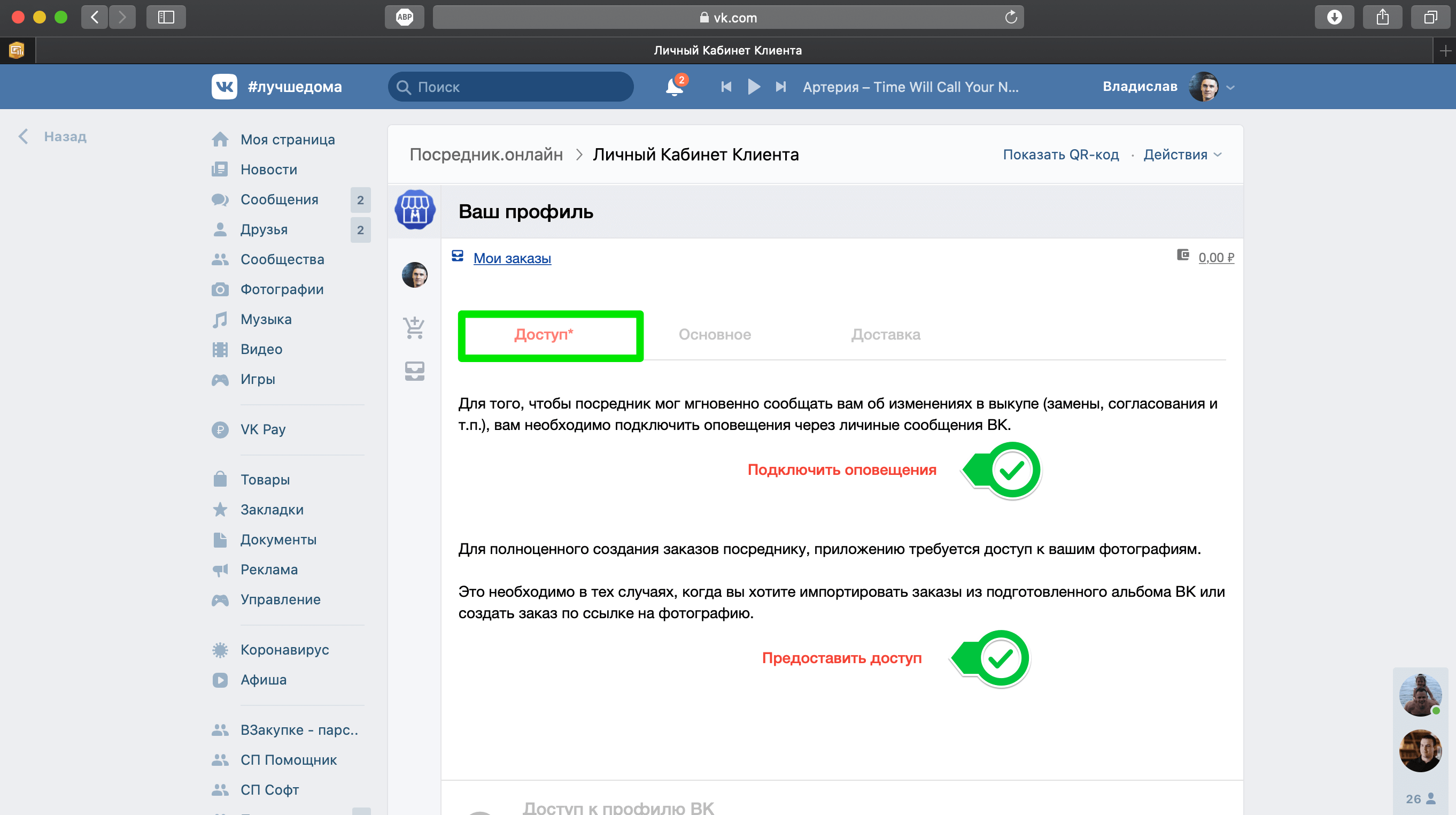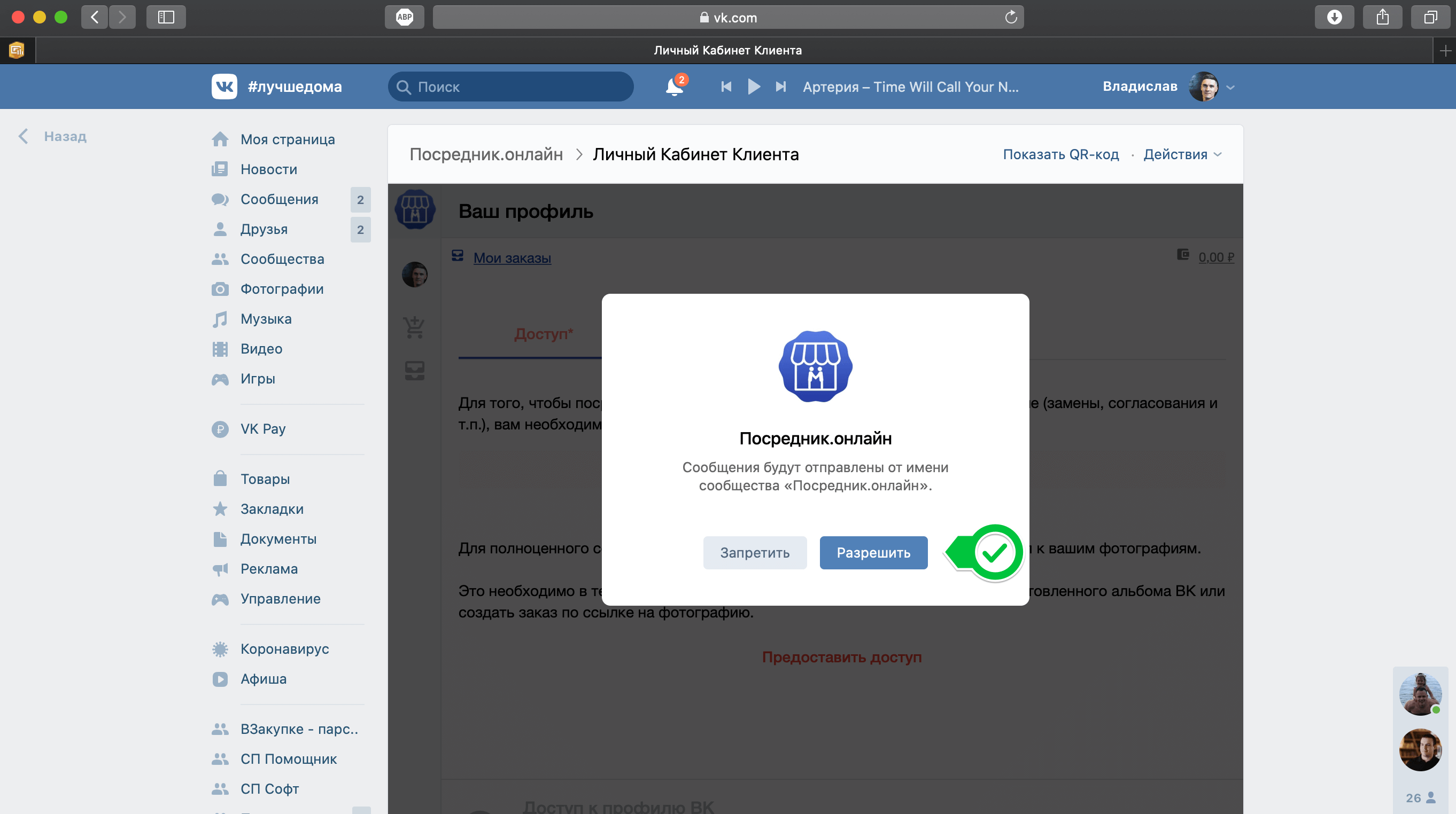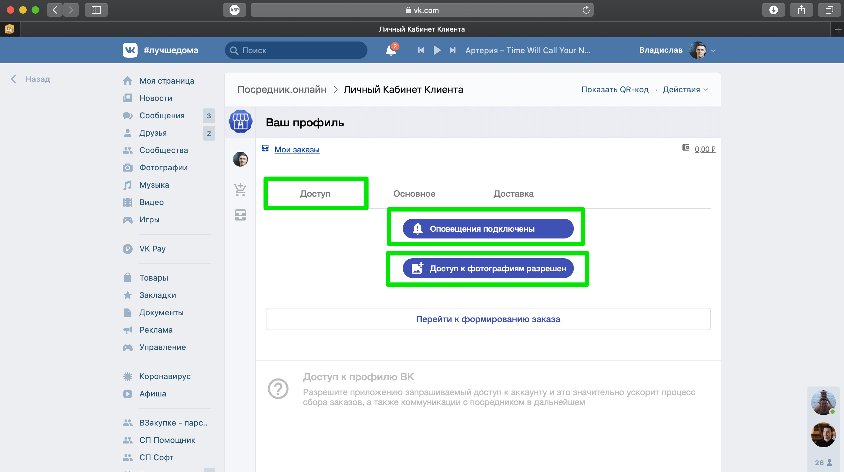 "Разрешение на рассылку оповещений" - с помощью данного разрешения мы сможем автоматически оповещать заказчиков сообщениями ВК о необходимости согласовать изменения в выкупе, оплатить заказ.