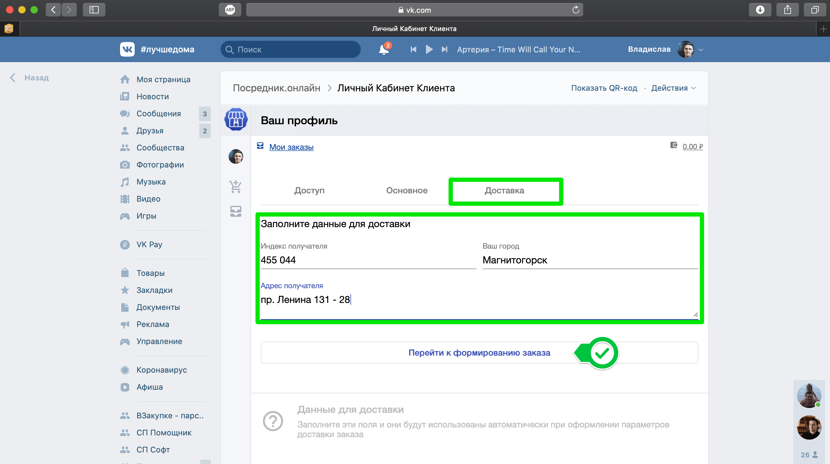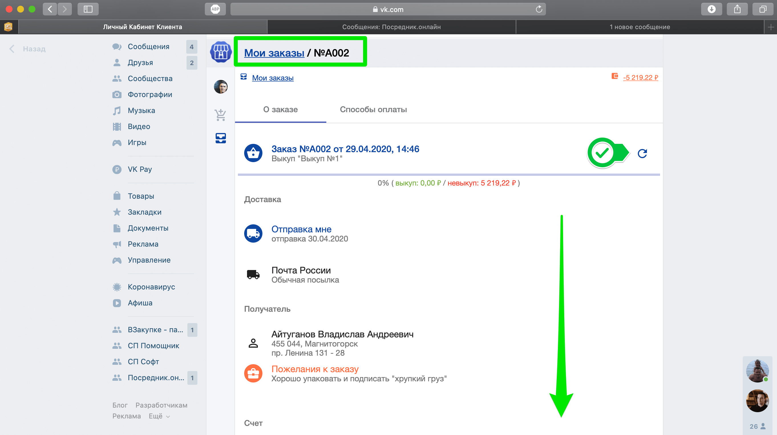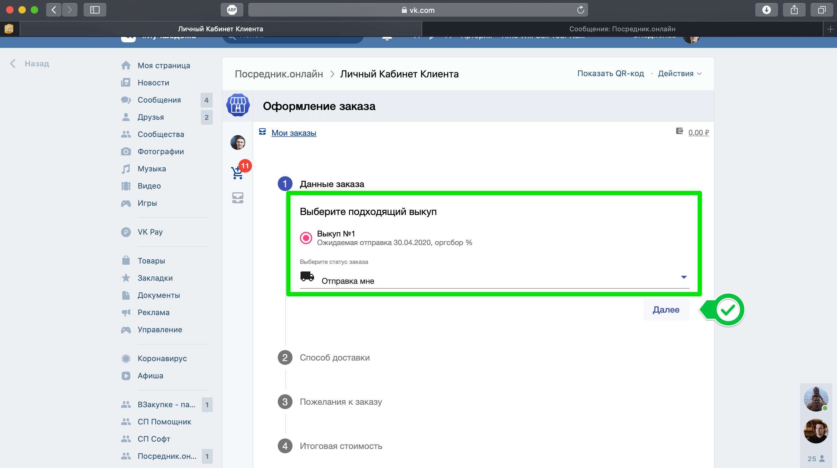 Для начала клиенту необходимо открыть ЛК в группе посредника, у которого он хочет оформить заказ.