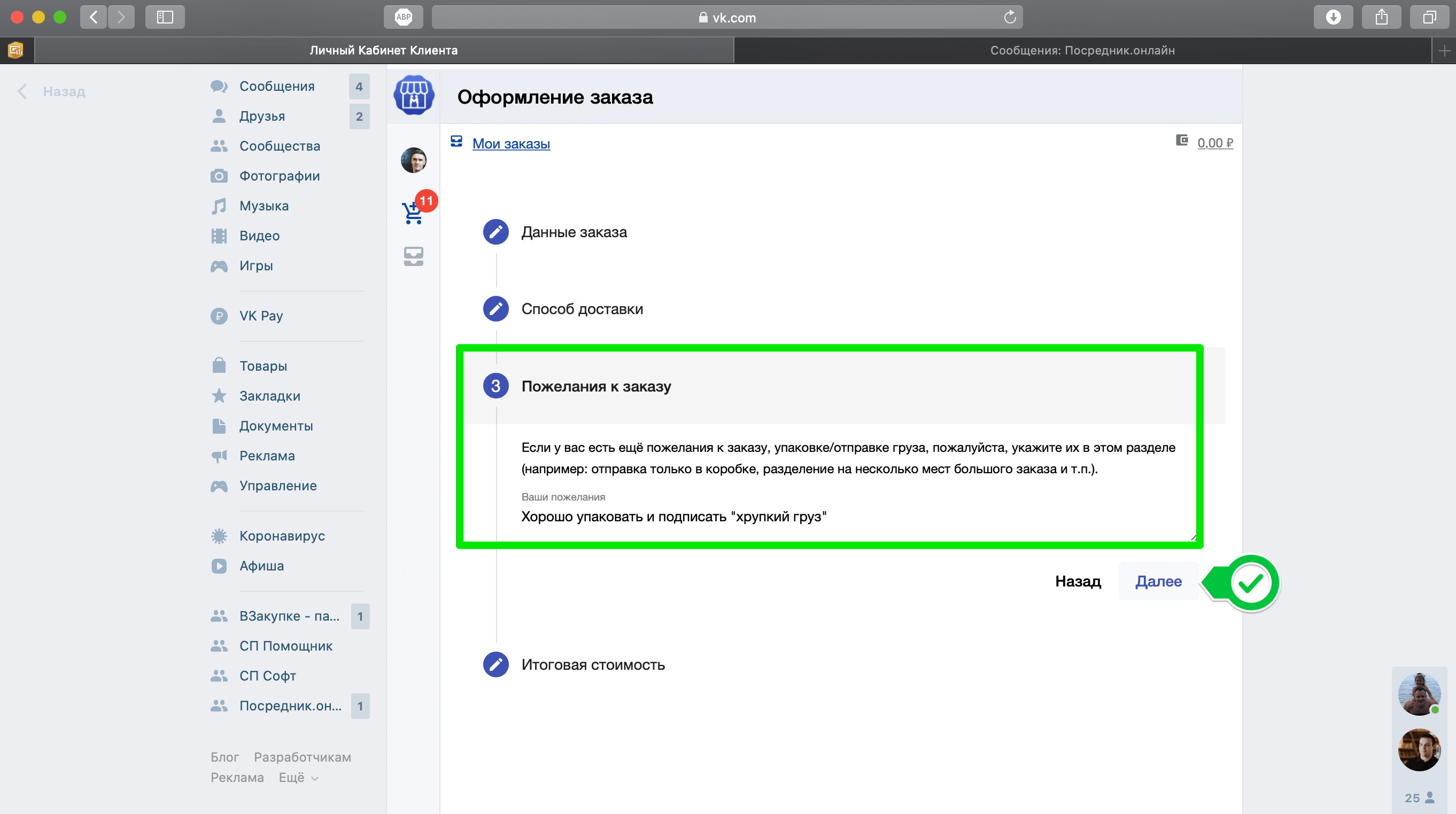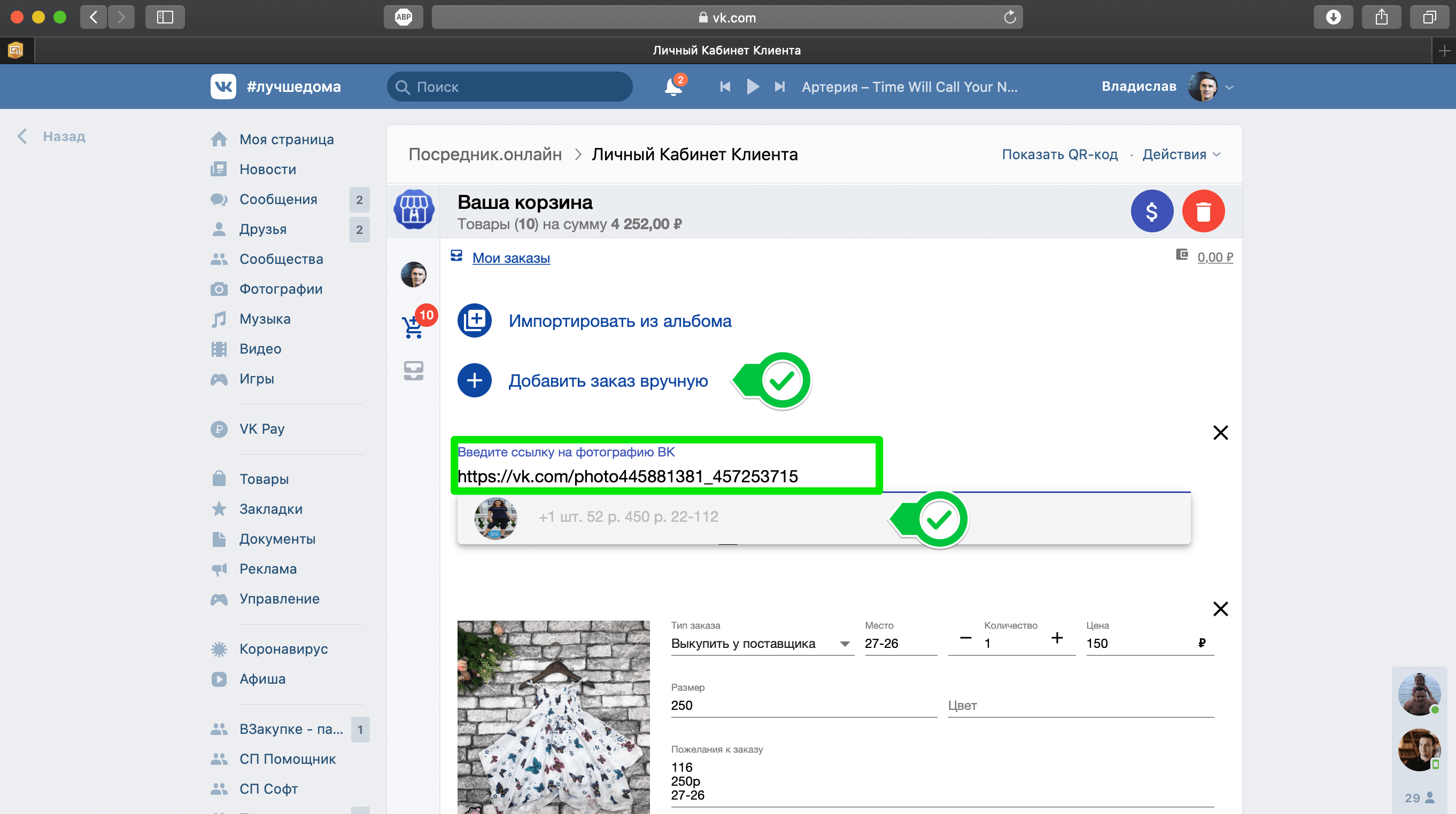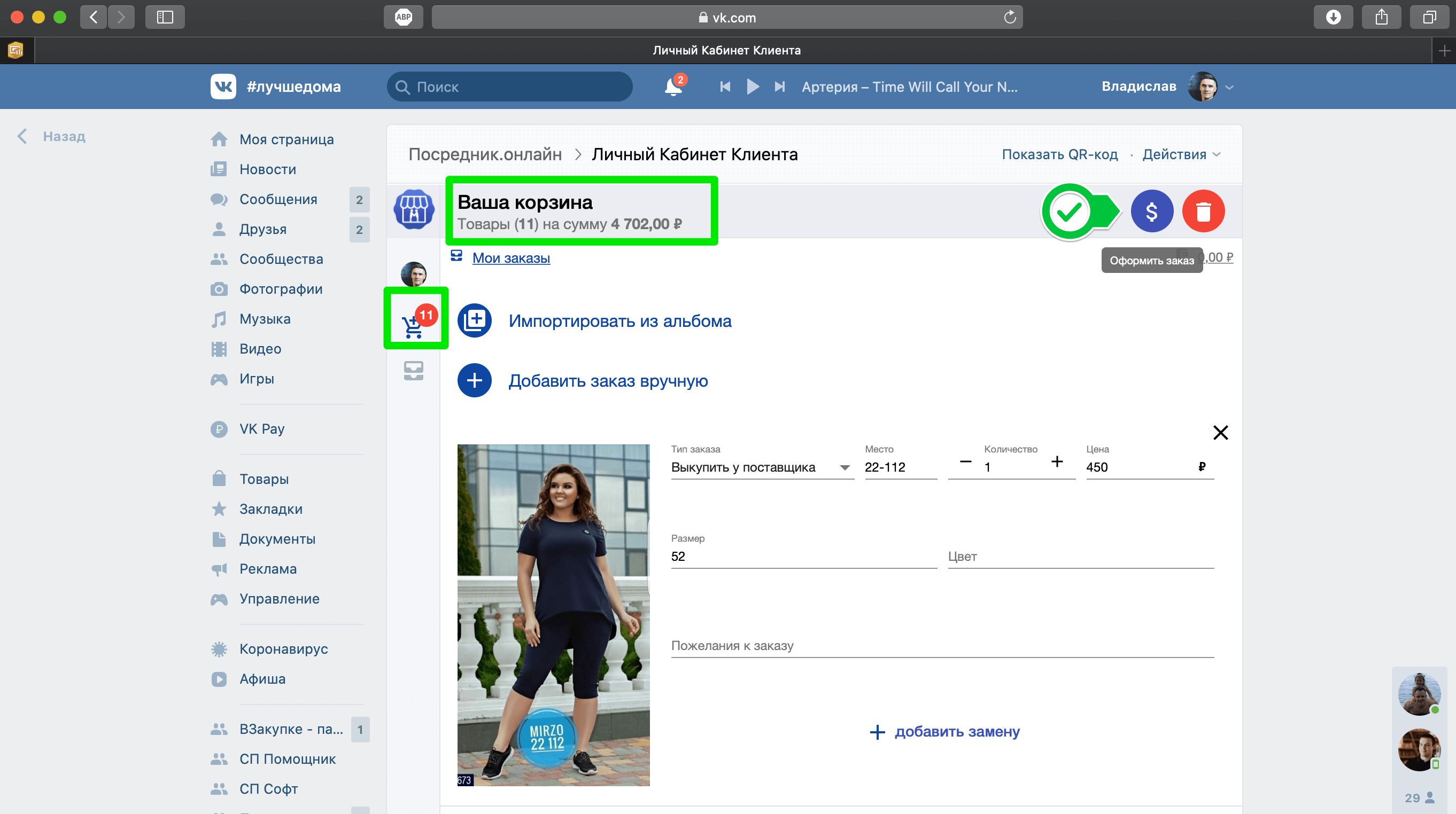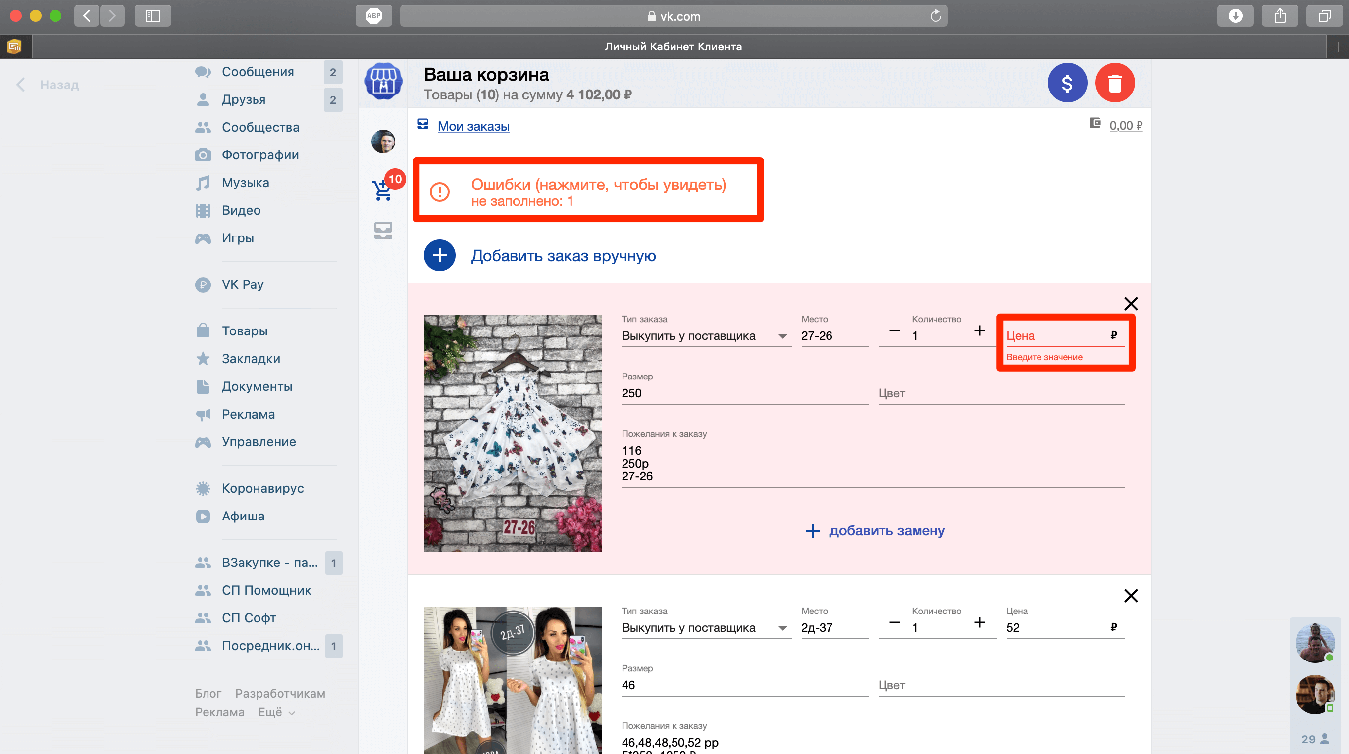 Также заказчик сможет загрузить основную часть из альбома ВК, а затем добавить какие-то позиции вручную. Во время оформления заказчик всегда будет видеть общее количество и сумму всех позиций, что позволит все время быть в курсе полной стоимости заказа без дополнительных подсчетов. Если какие-то позиции будут заполнены заказчиком некорректно (например неправильное или пустое место, пустая цена) мы заботливо и информативно об этом сообщим прямо в корзине и не позволим отправить такой заказ посреднику.