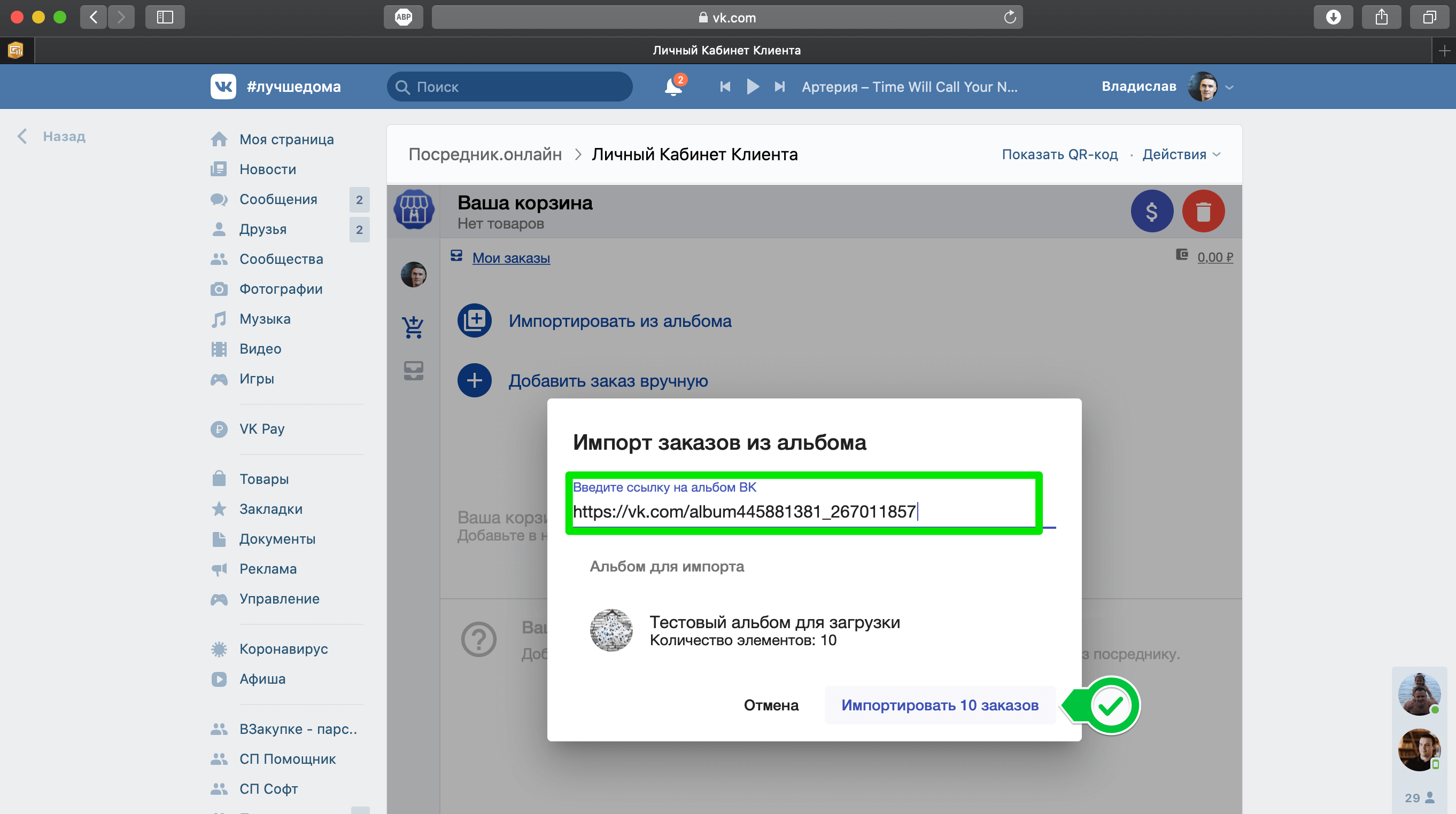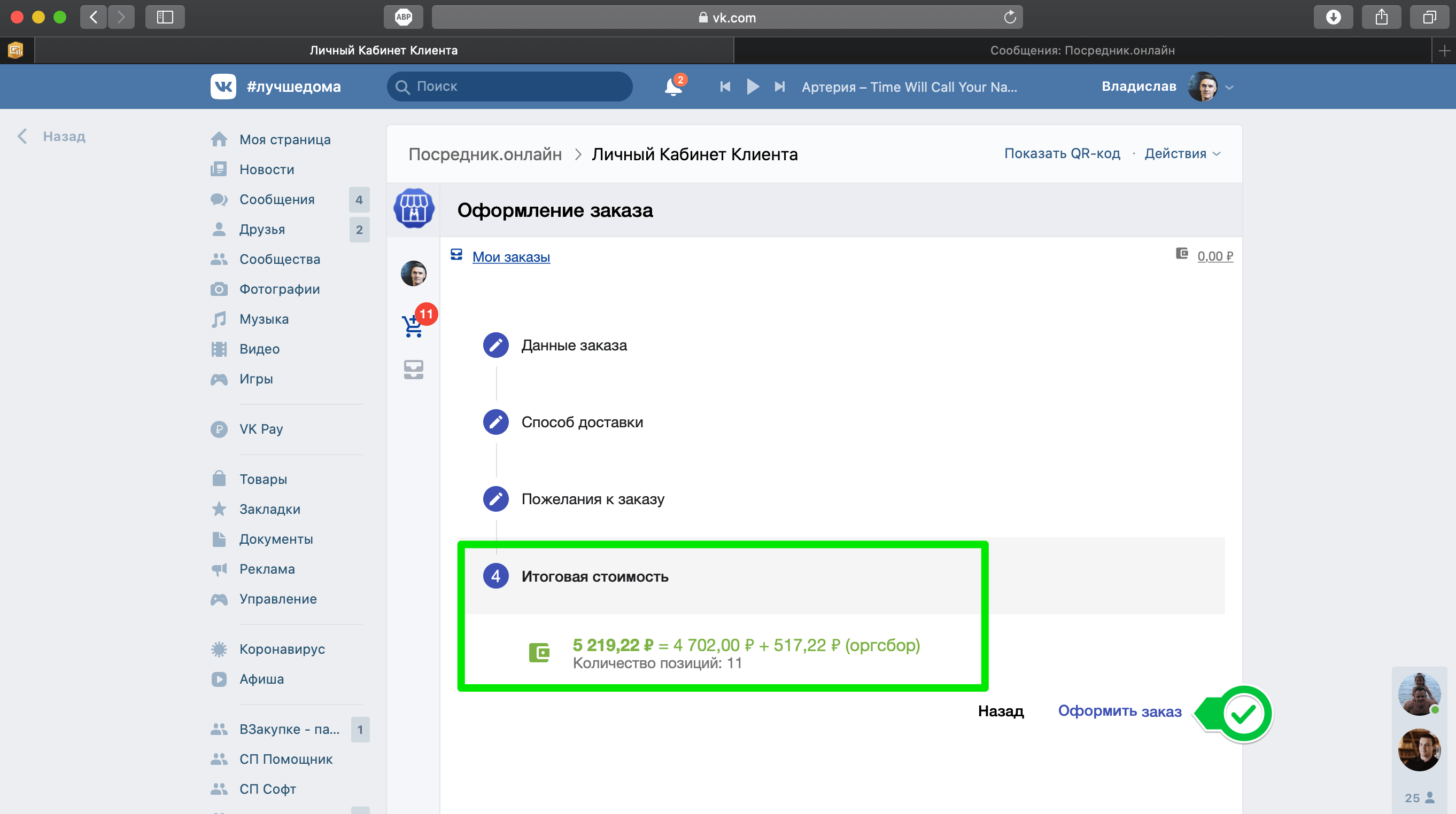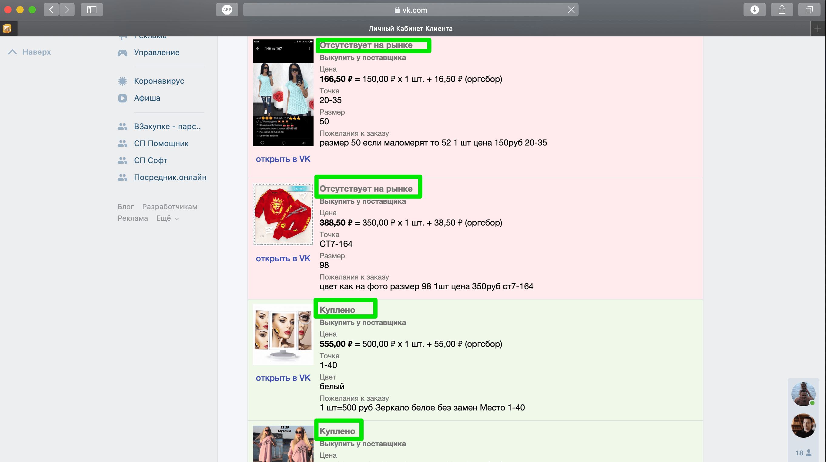 Также заказчик сможет загрузить основную часть из альбома ВК, а затем добавить какие-то позиции вручную. Во время оформления заказчик всегда будет видеть общее количество и сумму всех позиций, что позволит все время быть в курсе полной стоимости заказа без дополнительных подсчетов. Если какие-то позиции будут заполнены заказчиком некорректно (например неправильное или пустое место, пустая цена) мы заботливо и информативно об этом сообщим прямо в корзине и не позволим отправить такой заказ посреднику.