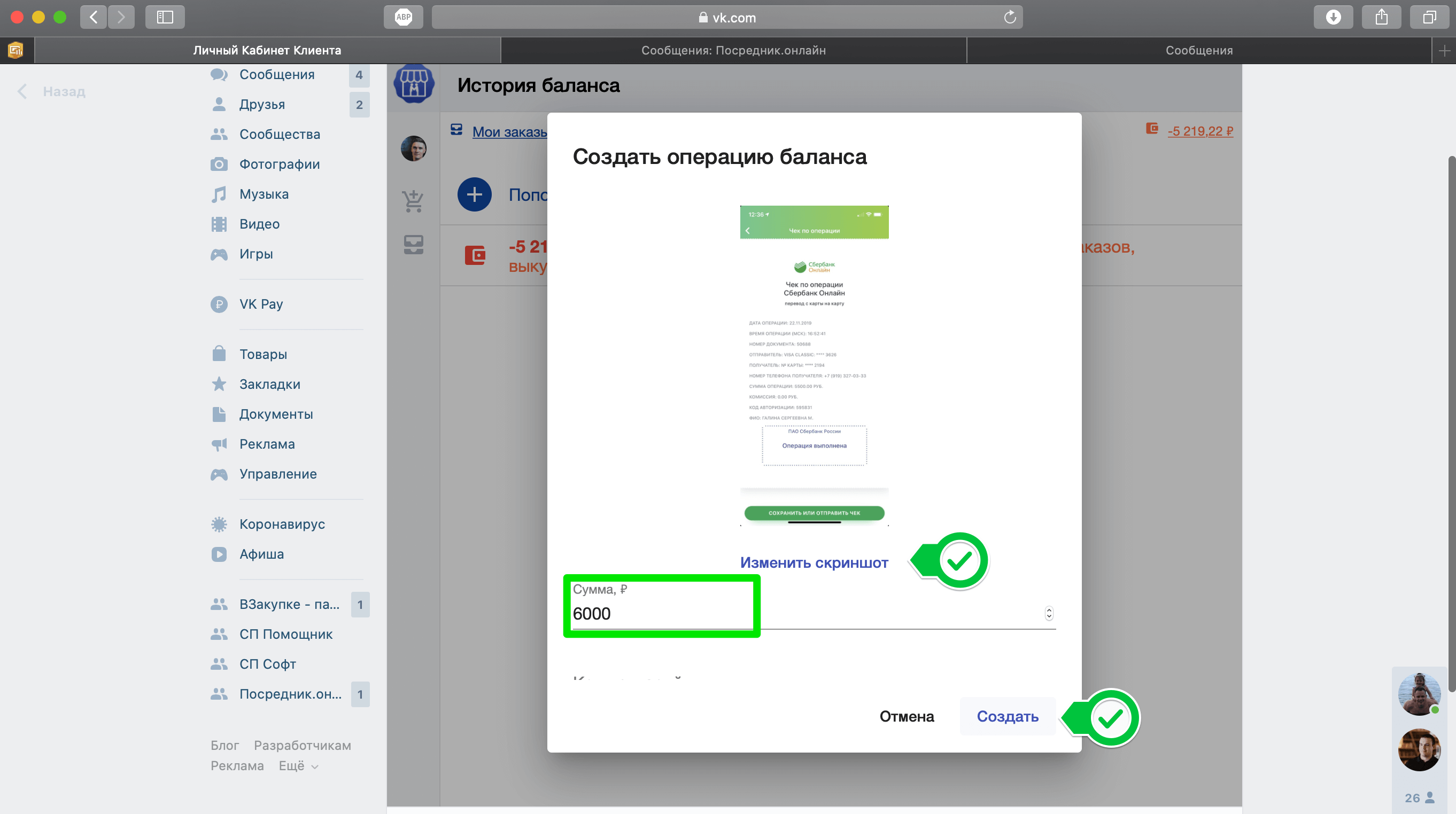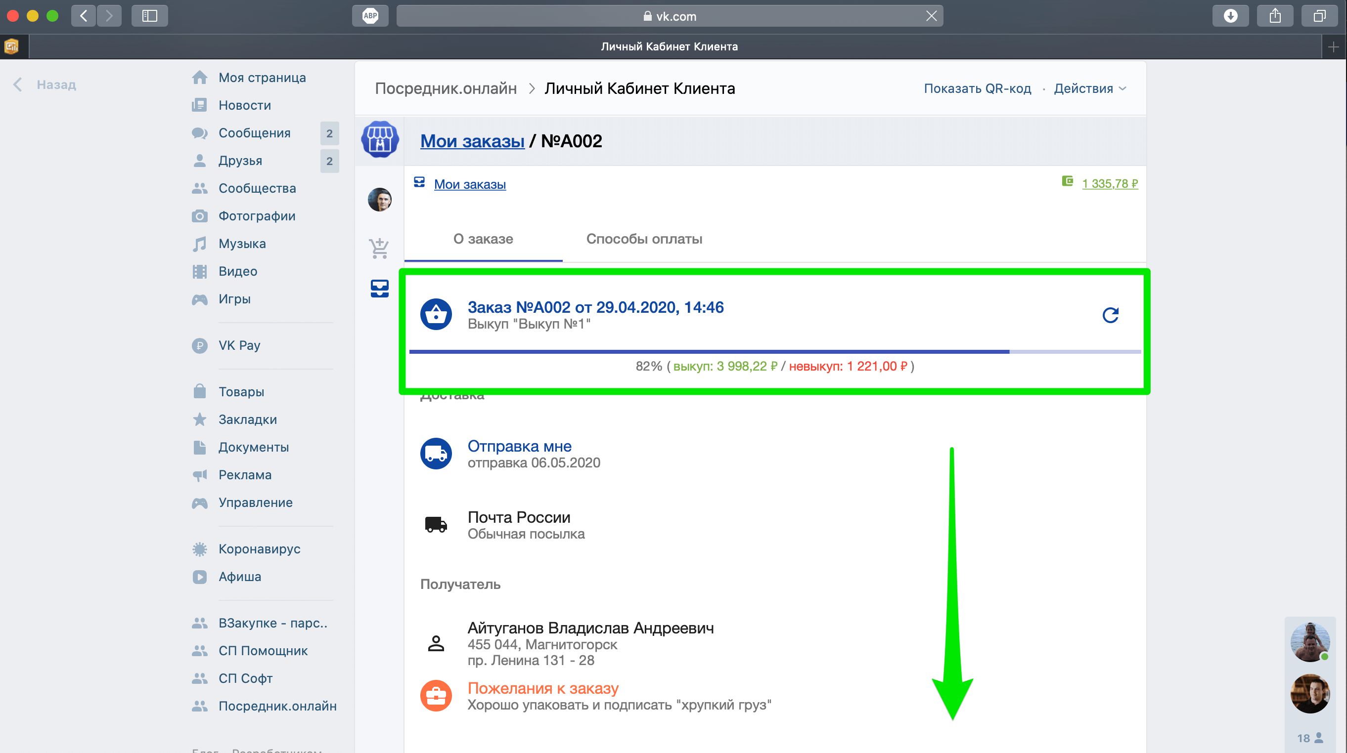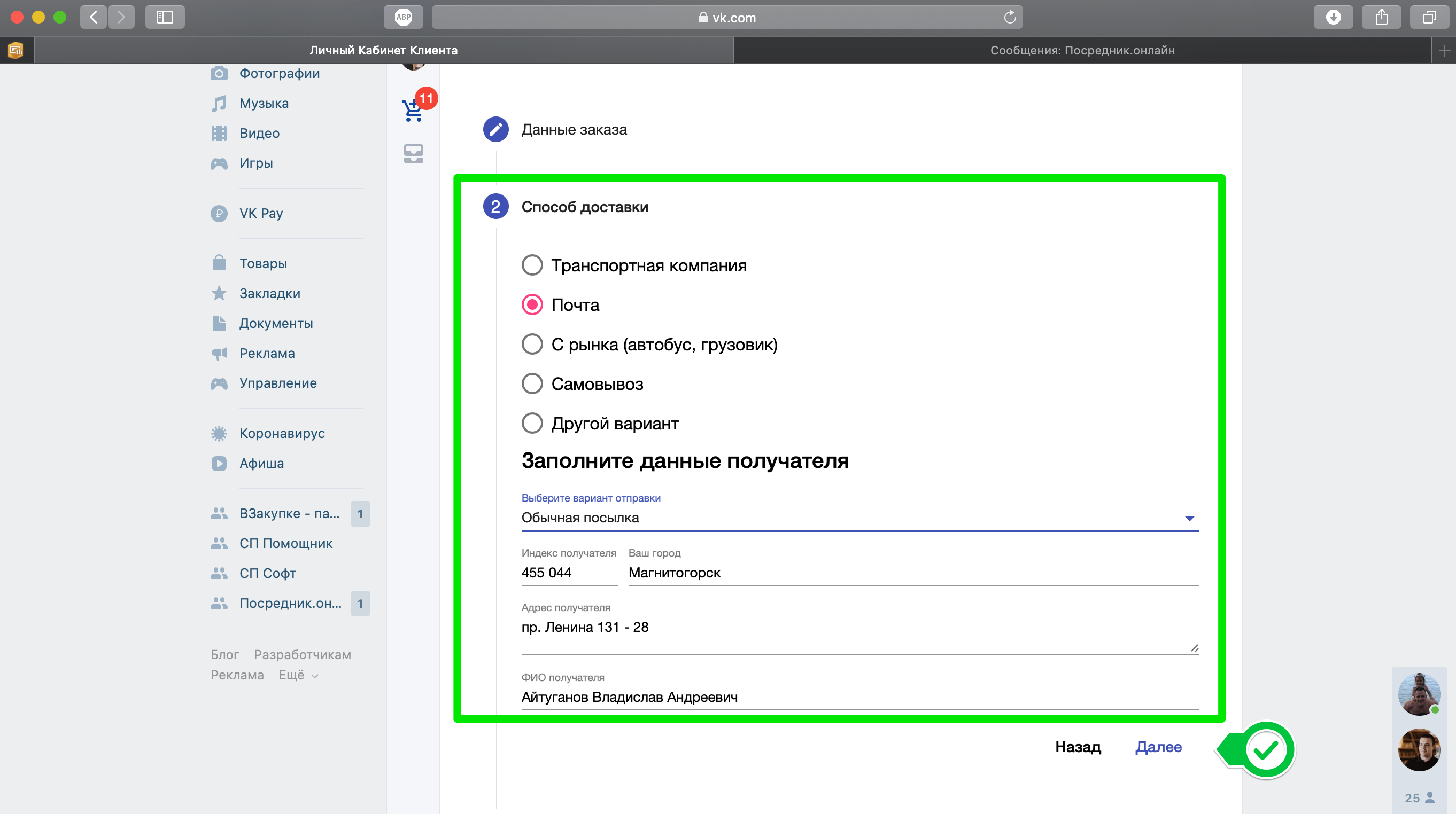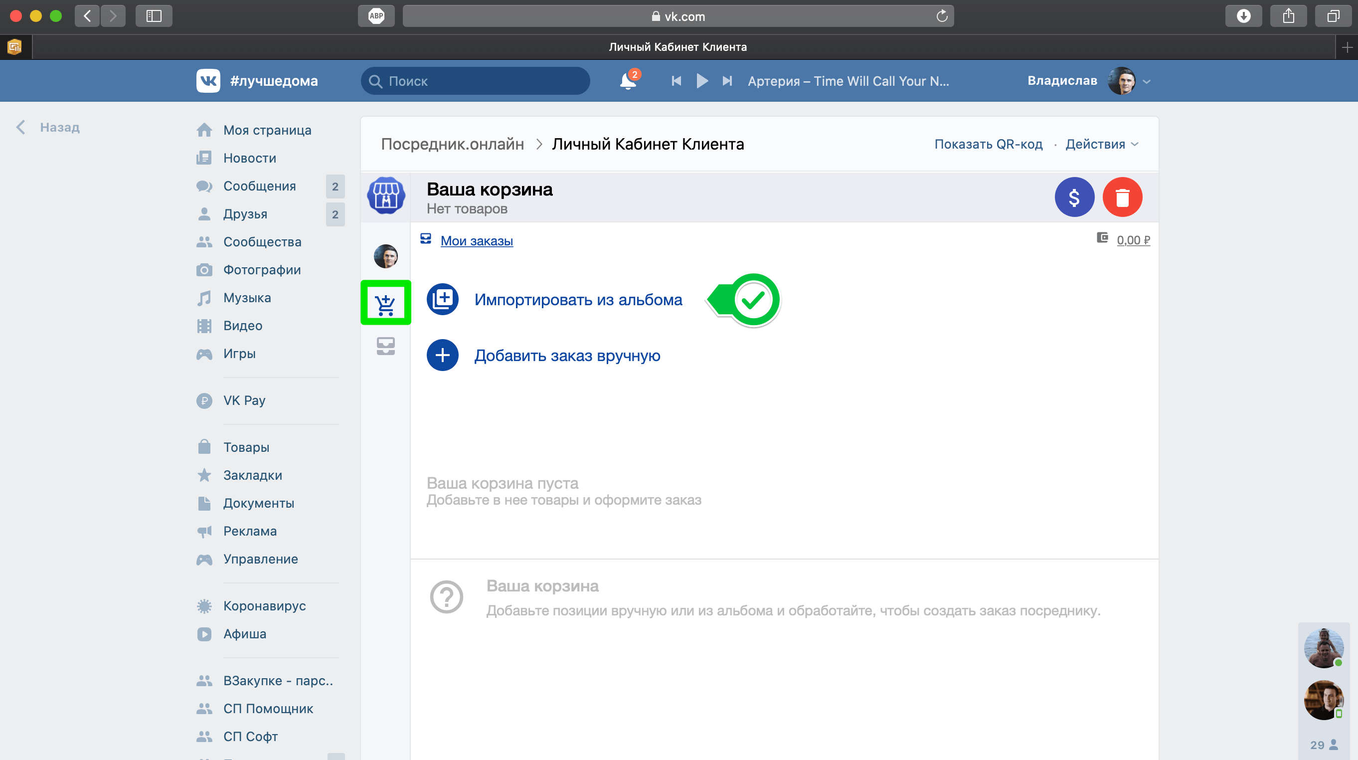 Также заказчик сможет загрузить основную часть из альбома ВК, а затем добавить какие-то позиции вручную. Во время оформления заказчик всегда будет видеть общее количество и сумму всех позиций, что позволит все время быть в курсе полной стоимости заказа без дополнительных подсчетов. Если какие-то позиции будут заполнены заказчиком некорректно (например неправильное или пустое место, пустая цена) мы заботливо и информативно об этом сообщим прямо в корзине и не позволим отправить такой заказ посреднику.